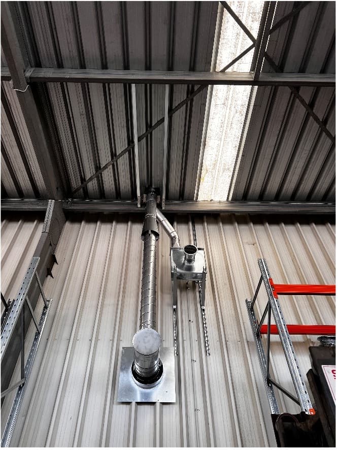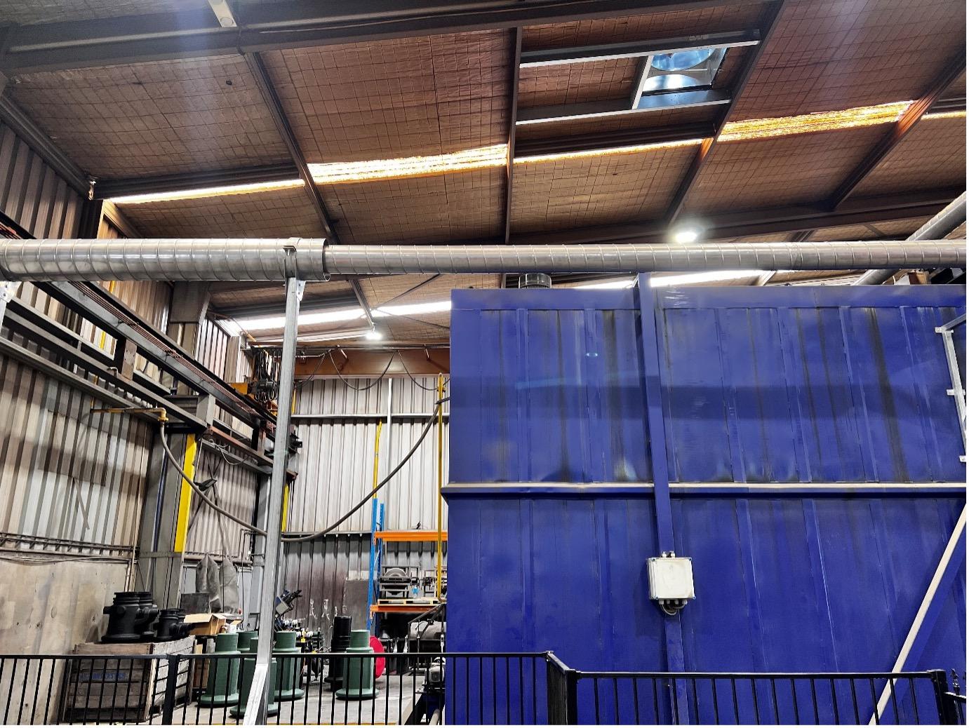 Customer Requirements: Heat & Fumes are exhausted out the top of a plastic moulding oven, and released directly into the factory. These to be exhausted out of the factory, ensuring a more comfortable working environment for staff.