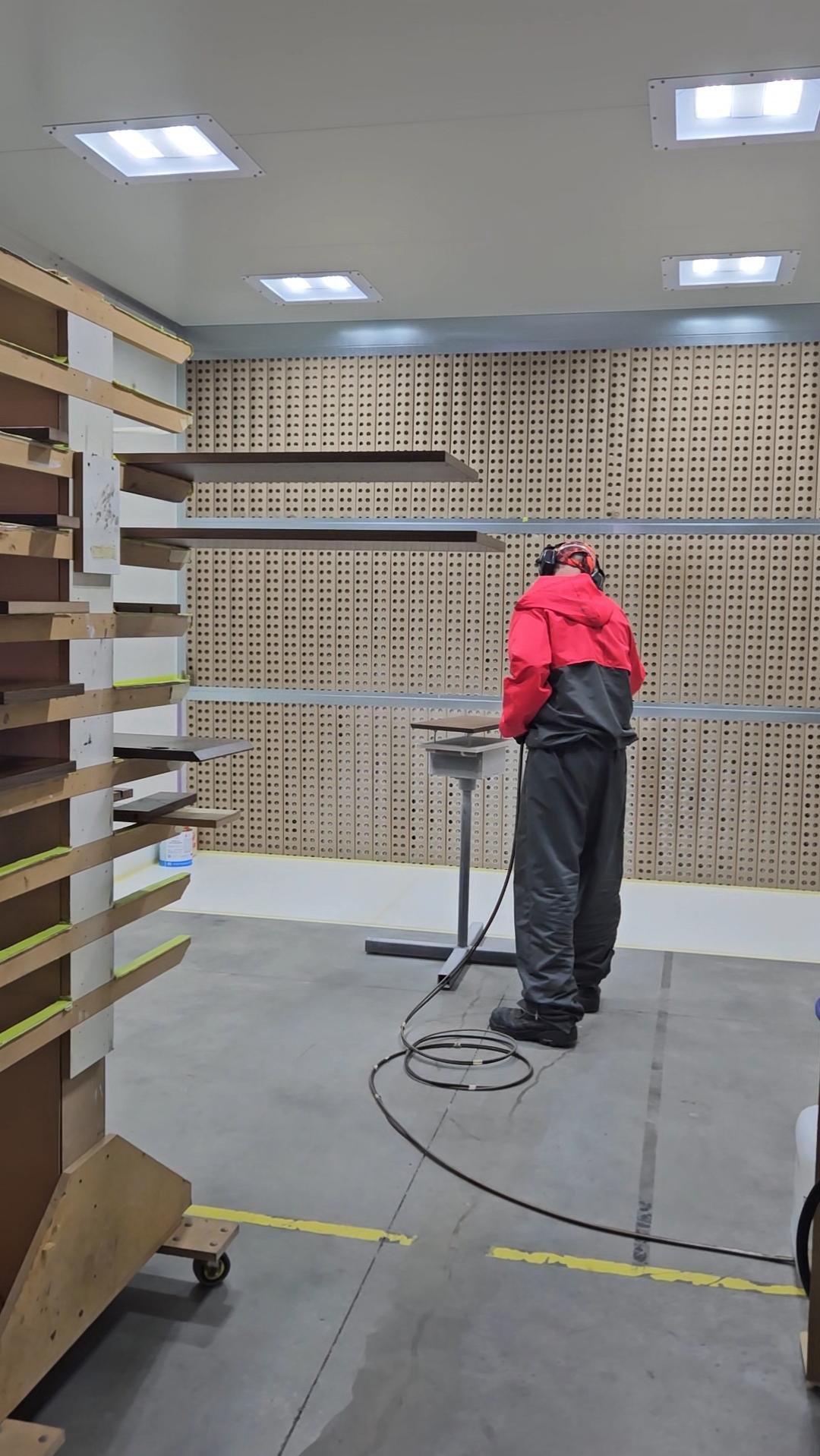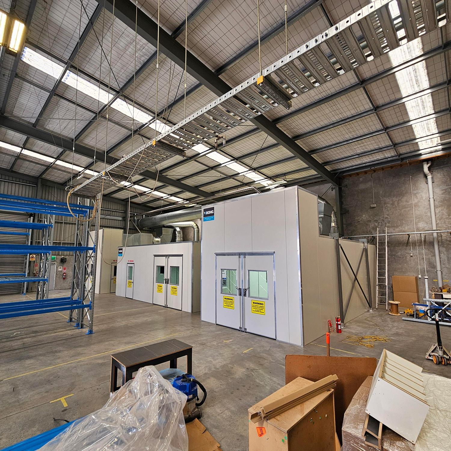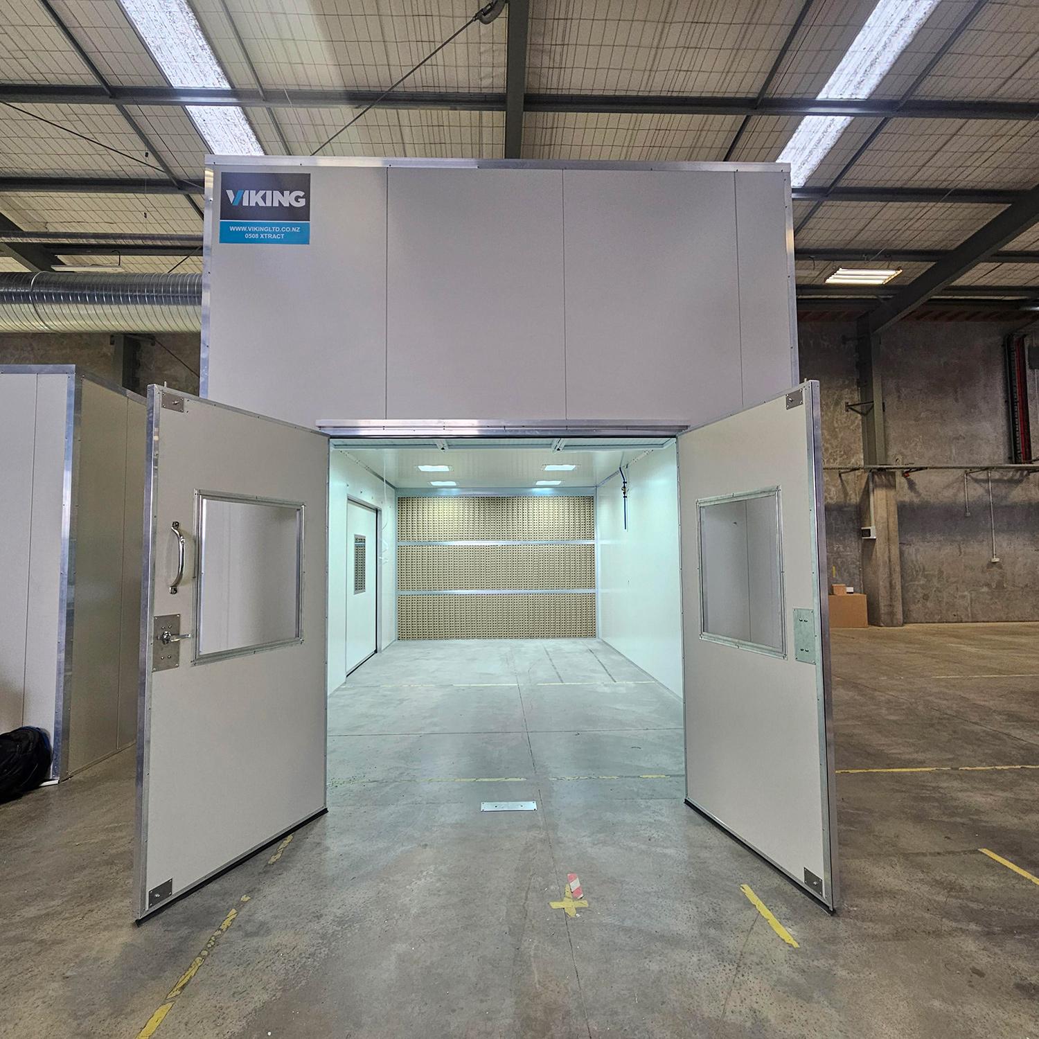 The Viking spray booths feature fully insulated cabins constructed from FIM-approved, fire-retardant XLAM panels. Each booth includes emergency exit doors, sliding access doors to the paint room, and double front-loading doors with large viewing windows and specialized hardware.
