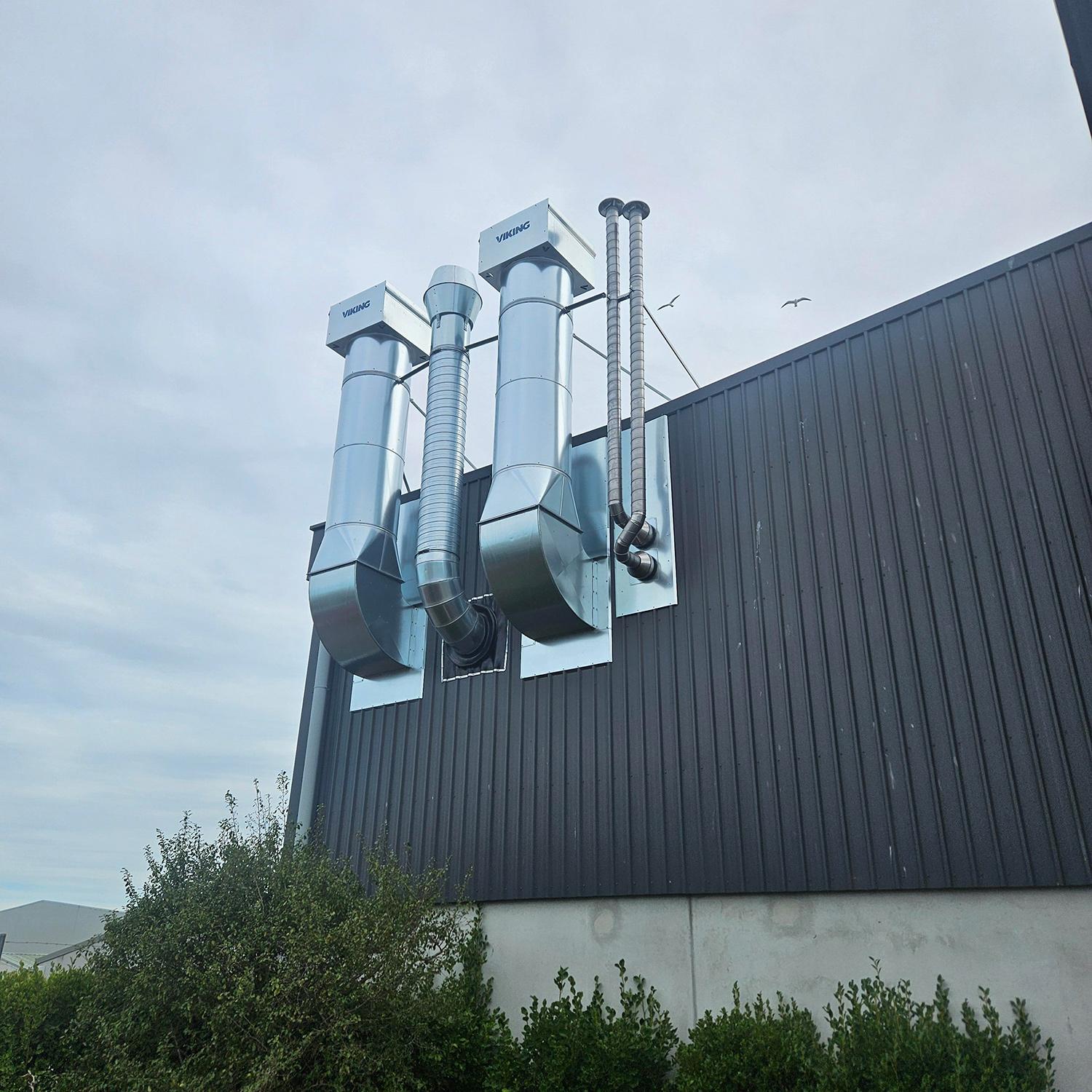 Air handling is provided by indirect-fired stainless steel heat exchangers equipped with LPG burners, fully insulated air handling units, and supply air fans. Due to the facility’s solar panel–covered roof, exhaust discharge is side-wall mounted and extends vertically 3 meters above the roofline.