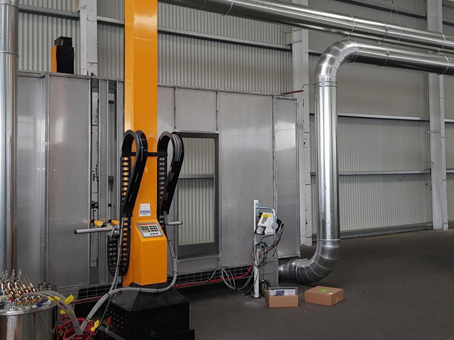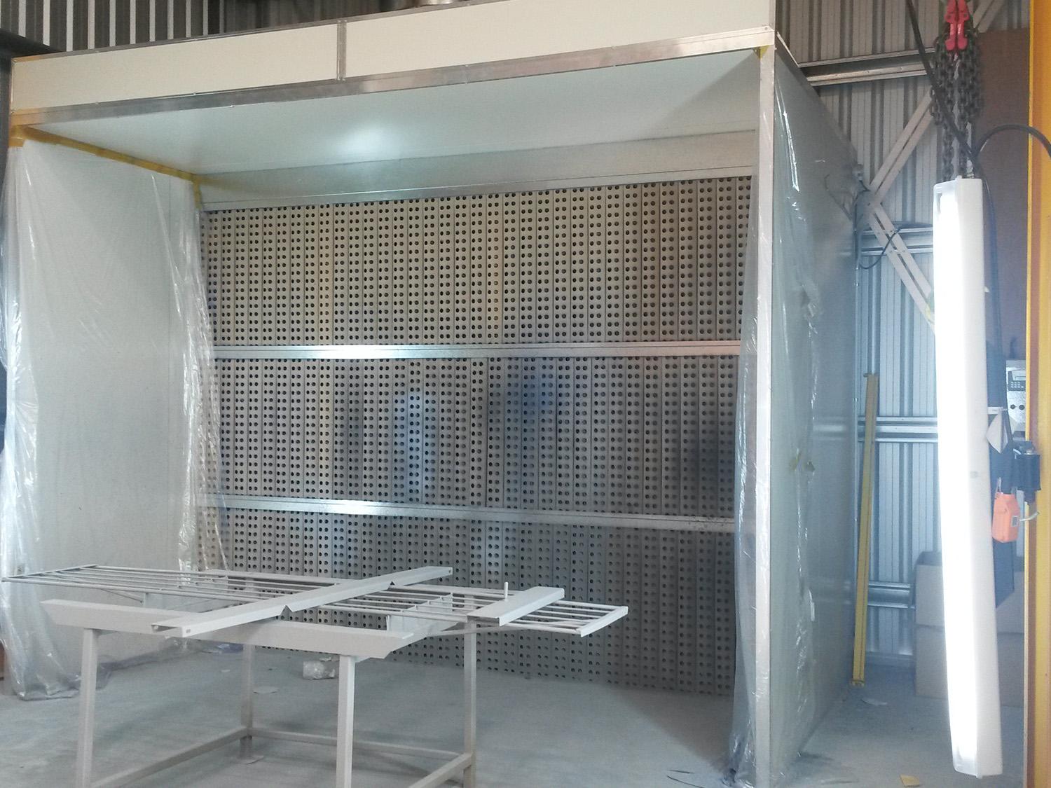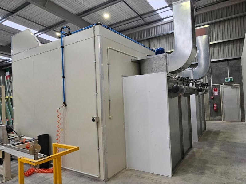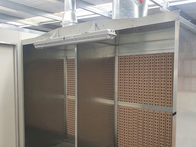Our powder coating spray booths include reverse pulse open-faced cartridge filter booths in 2m, 3m, and 4m widths, delivering 0.5m/sec face velocity. Features include compressed air manifolds with pulse cleaning valves and smooth, quiet-running NGM fans with silenced exhaust outlets.