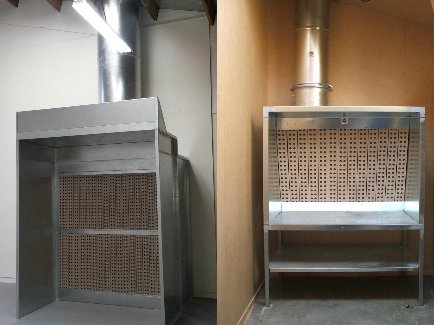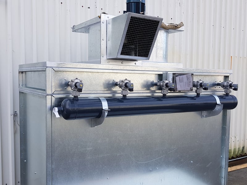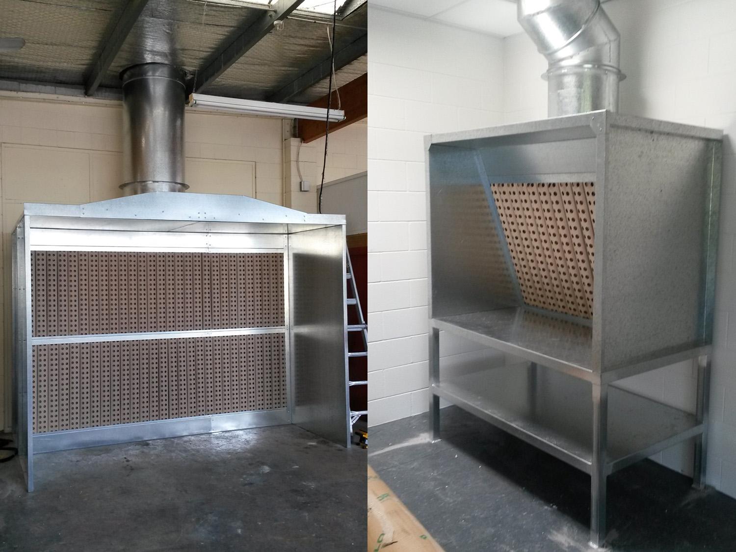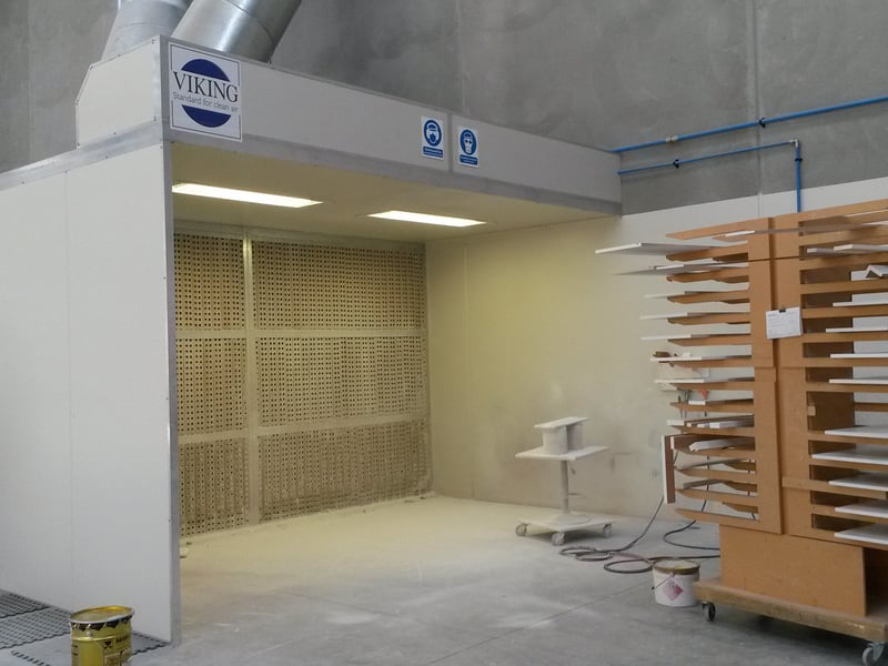 Our powder coating spray booths include reverse pulse open-faced cartridge filter booths in 2m, 3m, and 4m widths, delivering 0.5m/sec face velocity. Features include compressed air manifolds with pulse cleaning valves and smooth, quiet-running NGM fans with silenced exhaust outlets.